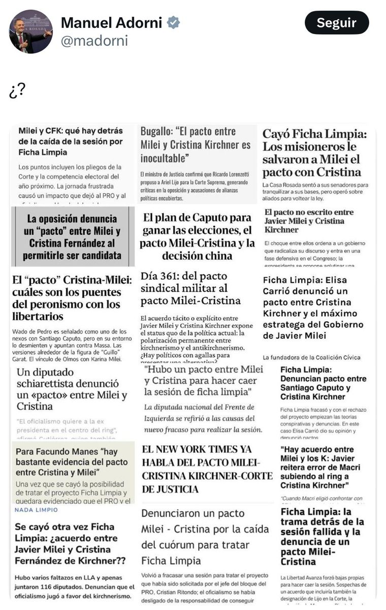 En otras publicaciones, el legislador electo juntó varios titulares que mencionaban ese hipotético pacto luego del fracaso del proyecto que buscaba inhabilitar las candidaturas electorales de personas condenadas. Es que, como su aprobación implicaba un impacto directo contra la expresidenta, desde espacios como el PRO y la Coalición Cívica apuntaron de lleno contra el Gobierno.