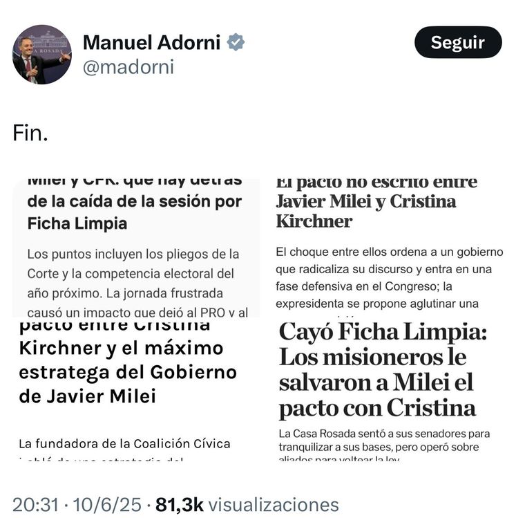 Inmediatamente después de conocer el fallo, Adorni disparó en su cuenta de X: “Muy extraño resultó el ‘pacto de impunidad’”, en referencia a la supuesta alianza entre el oficialismo y el kirchnerismo que denunciaron desde otros partidos políticos tras la caída de Ficha Limpia.