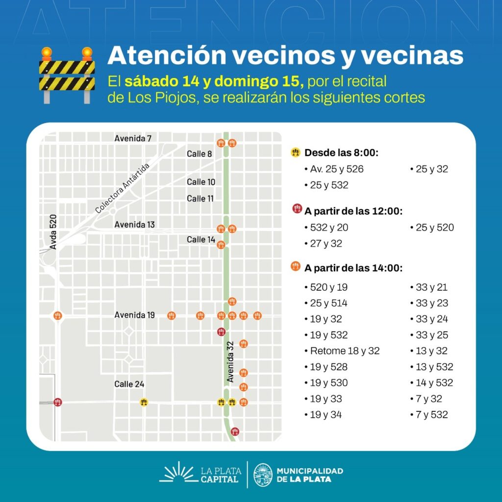 Con el objetivo de garantizar el normal desarrollo de los recitales de Los Piojos que se realizarán el sábado 14 y el domingo 15 en el Estadio Único Diego Armando Maradona, la Municipalidad de La Plata prepara un operativo de prevención con controles y desvíos a la circulación vehicular.