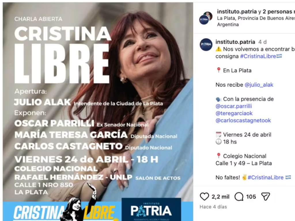 La actividad, impulsada por el Instituto Patria, está prevista para este viernes y tendrá lugar en una institución que depende de la Universidad Nacional de La Plata, lo que motivó cuestionamientos por el uso de un espacio educativo para un evento de carácter político-partidario.