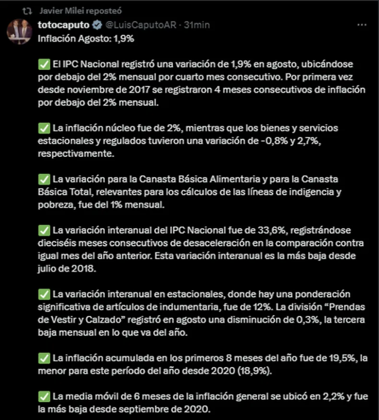 “De nuevo la inflación debajo del 2%. Luis Caputo. Y eso que fue en el contexto de un mes de muchísima volatilidad en la demanda de dinero”, publicó Milei en su cuenta de X.