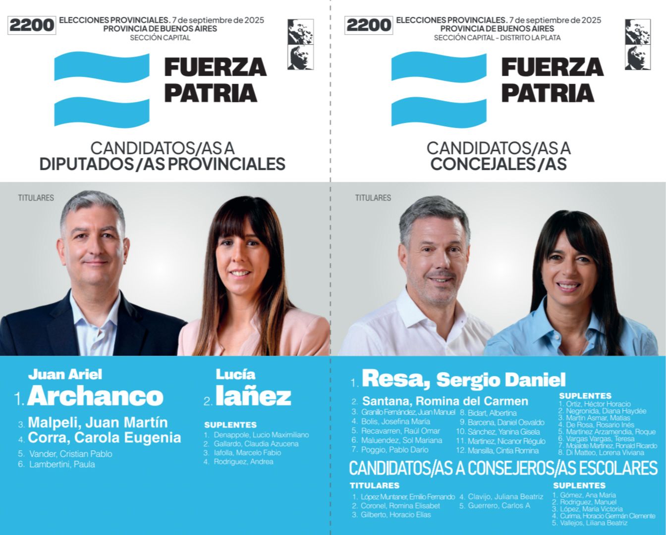 En el marco superior izquierdo se encuentra el número de lista (2200); en el margen derecho dos recuadros con las imágenes de Juan Domingo Perón, Eva Duarte de Perón y Néstor Kirchner; mientras que los dos cuerpos que indican las categorías deben decir «Candidatos/as a Diputados/as provinciales» y «Candidatos/as a Concejales/as».