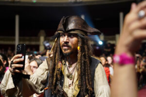 Mientras tanto, en las inmediaciones del Palacio Municipal, cientos de vecinos y vecinas se congregaron para saludarlo, muchos de ellos caracterizados como el emblemático Jack Sparrow o personajes alusivos, con carteles, banderas y cánticos que transformaron la plaza y las calles en una verdadera fiesta cinematográfica.
